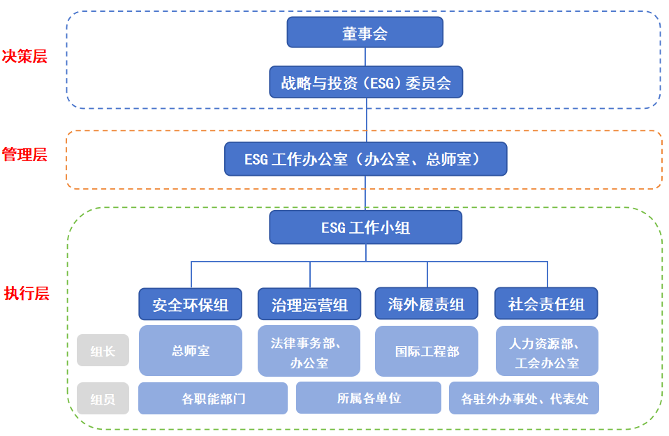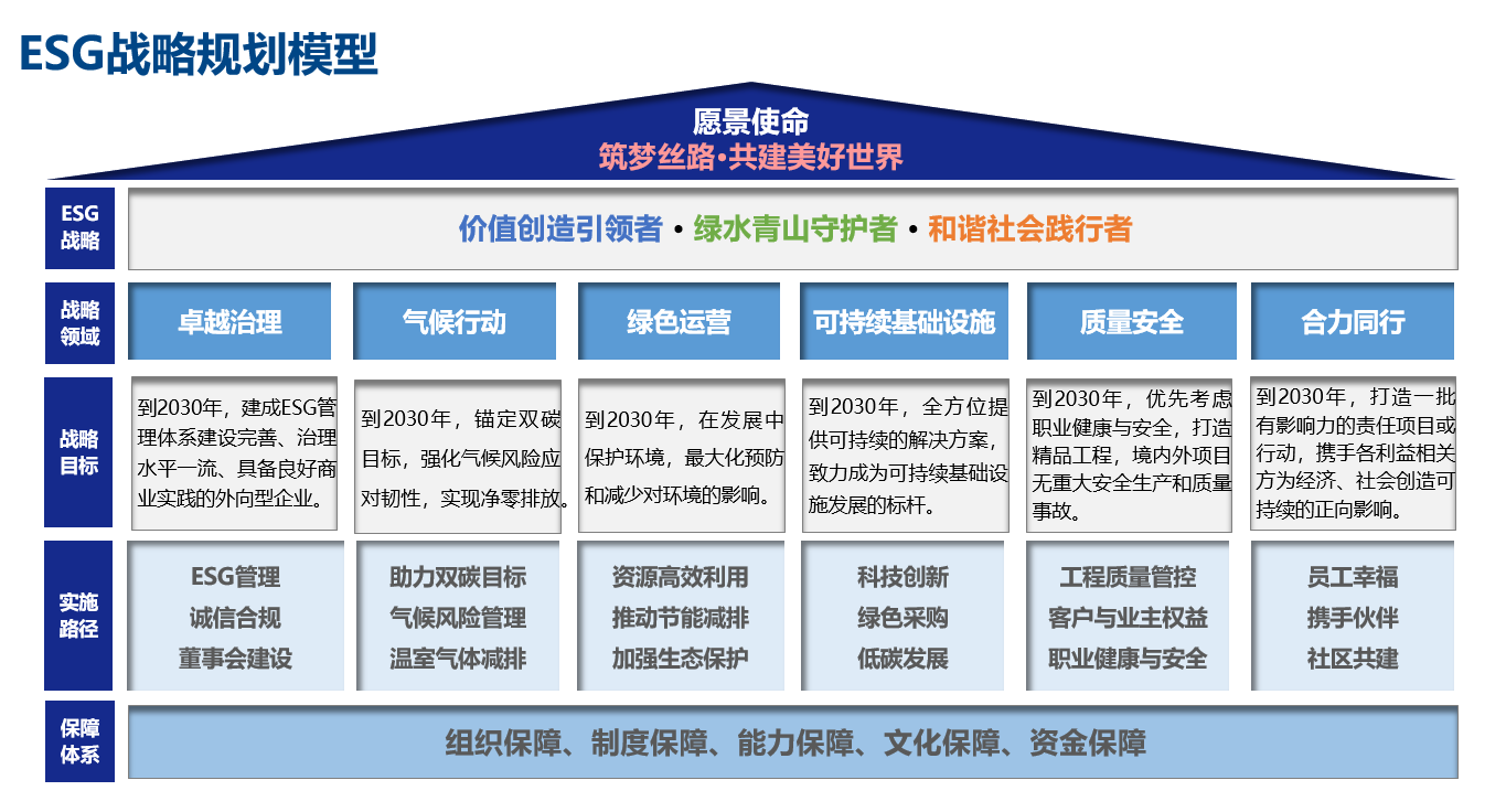 公司ESG战略规划构建了包括使命愿景、战略框架、战略领域、目标设定、实施路径及保障体系在内的完整模型。模型立足环境、社会、治理三大支柱,规划聚焦六大重点领域,提出了18项关键实施路径,构筑了覆盖决策层、管理层和执行层的三层级ESG组织架构。