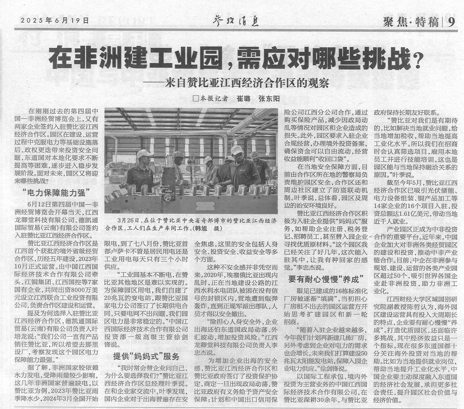 6月19日,《参考消息》发表特稿《在非洲建工业园,需应对哪些挑战?——来自赞比亚江西经济合作区的观察》,深度报道了赞比亚江西经济合作区发展实践。文章通过采访公司有关负责同志、入驻企业代表和专家学者,围绕破解电力短缺、应对安全风险、提供“一站式保姆服务”等方面,详实讲述了合作区克服多重挑战实现平稳发展的历程。报道指出,产业园区正成为中非投资合作的重要平台,赞比亚江西经济合作区已吸引16个项目入驻,投资总额达1.61亿美元,带动当地近千人就业。现将全文转载如下: