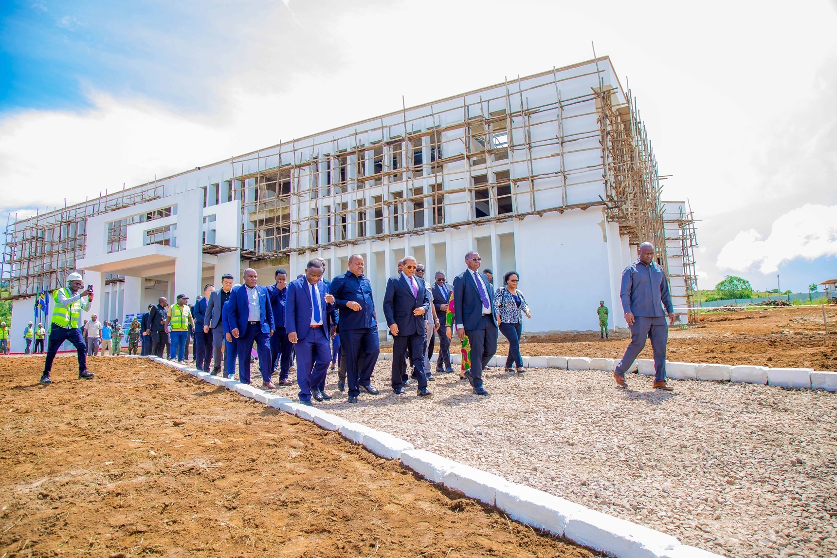 12月15日,由公司总承包建设的达累斯萨拉姆大学(UDSM)卡盖拉校区项目在坦桑尼亚卡盖拉大区布科巴市隆重举行揭牌仪式,坦桑尼亚总统哈桑代表、副总统伊曼纽尔·恩钦比博士出席并致辞。前总统贾卡亚·基奎特、教育和科技部长姆肯达以及当地官员,校方管理人员,公司驻坦桑尼亚办事处负责人、项目经理部主要成员参加揭牌仪式。当地媒体到场进行报道。 恩钦比副总统表示,建设UDSM卡盖拉校区是哈桑总统致力于扩大高等教育、确保坦桑尼亚每个大区都有一所大学的承诺。希望校方发挥卡盖拉校区创新创造与应用研究中心的作用,为坦桑尼亚培养出具有区域与全球竞争力的年轻人才。讲话中,恩钦比副总统强调该项目对坦桑尼亚高等教育的重要性,希望公司高质量实施好该项目,按期完工,造福更多师生。 达累斯萨拉姆大学卡盖拉校区项目位于坦桑尼亚西北部的卡盖拉大区布科巴市,主要建设一栋学术与行政综合楼、一栋商务中心、一栋学生公寓及其他附属室外工程。截至目前,项目总进度达80%,并进入装饰装修施工阶段。